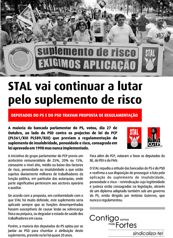 Como organização integrante da Frente Comum de Sindicatos da Administração Pública, o STAL está empenhado na defesa e promoção desta estrutura enquanto espaço privilegiado de construção da unidade e fortalecimento da luta dos trabalhadores.